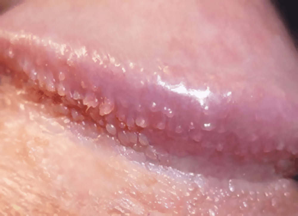• Xuất hiện các u nhú nhỏ màu trắng hoặc hồng nhạt ở mép vùng kín